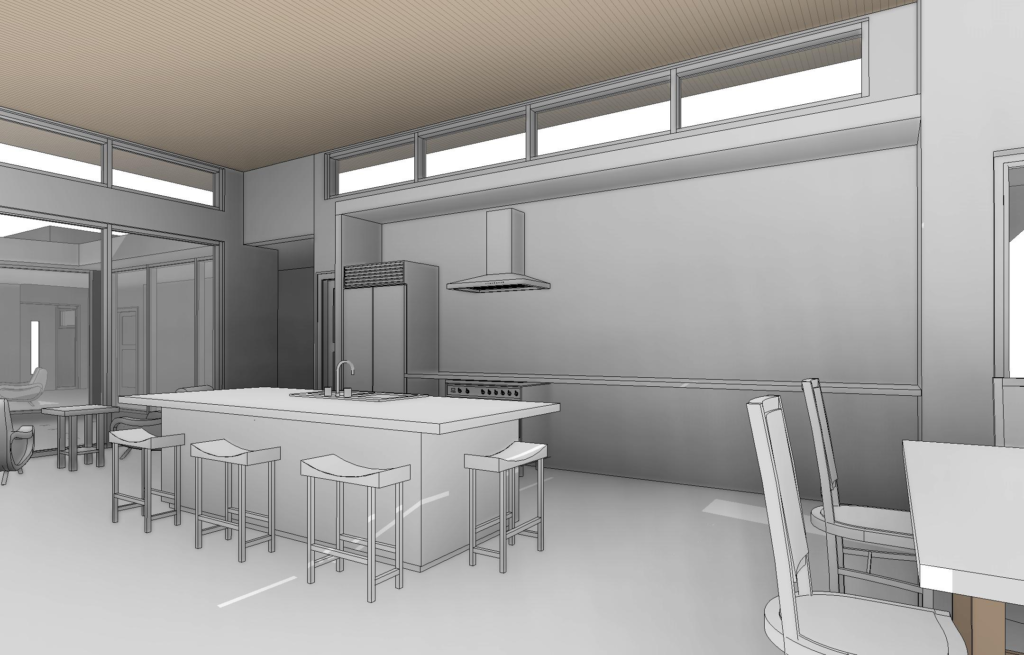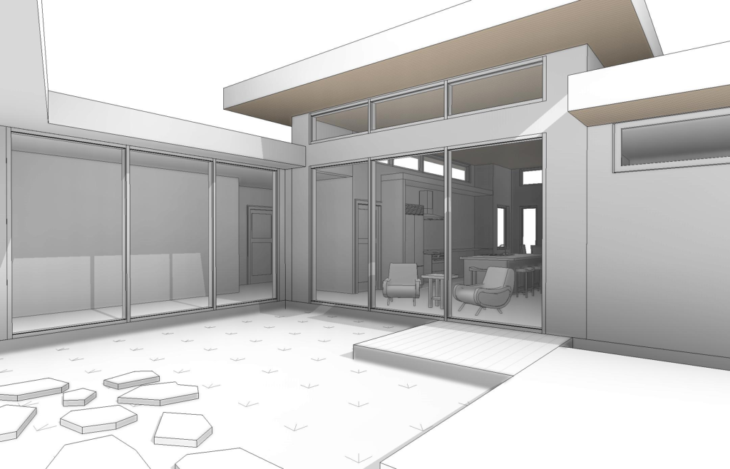 Designed for a nature photographer, this large home features a central courtyard and an assembly of high windows. Spaces are designed for wheelchair accessibility.